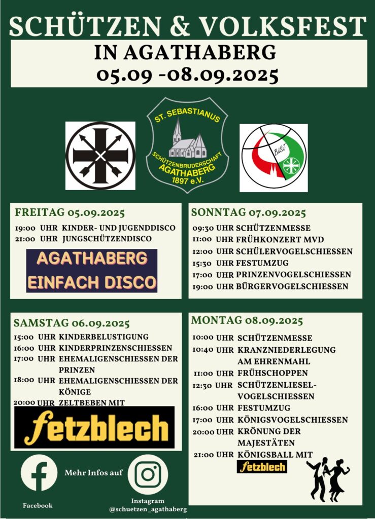 Vom 05. bis 08. September 2025 feierten wir wieder unser traditionelles Schützen- und Volksfest in Agathaberg – ein Wochenende voller Gemeinschaft, Musik, spannender Wettbewerbe und vieler schöner Momente.